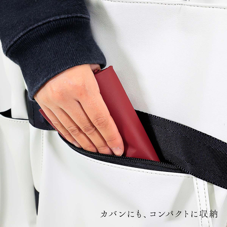 薄めのエシカル合皮を使用しているため、折り畳めばコンパクトに。 付属の収納ケースに入れれば、いつものカバンの中にすっきり収まります。 さらに、ケースには「ハトメリング」が付いているのが隠れたポイント! お手持ちのカラビナ等を使えば、メインバッグやリュックの外側にぶら下げておくことができます。「あ、エコバッグ忘れた!」という悲劇も防げます。(※カラビナは付属しておりません)