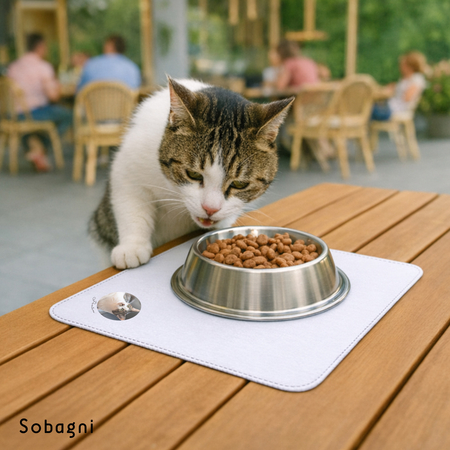 愛猫のごはんマットとしても: 撥水性に優れた高耐久素材なので、食べこぼしもサッと拭くだけ。愛猫自身の写真が入った専用の食事スペースとして、毎日のお食事タイムをより特別に彩ります。
