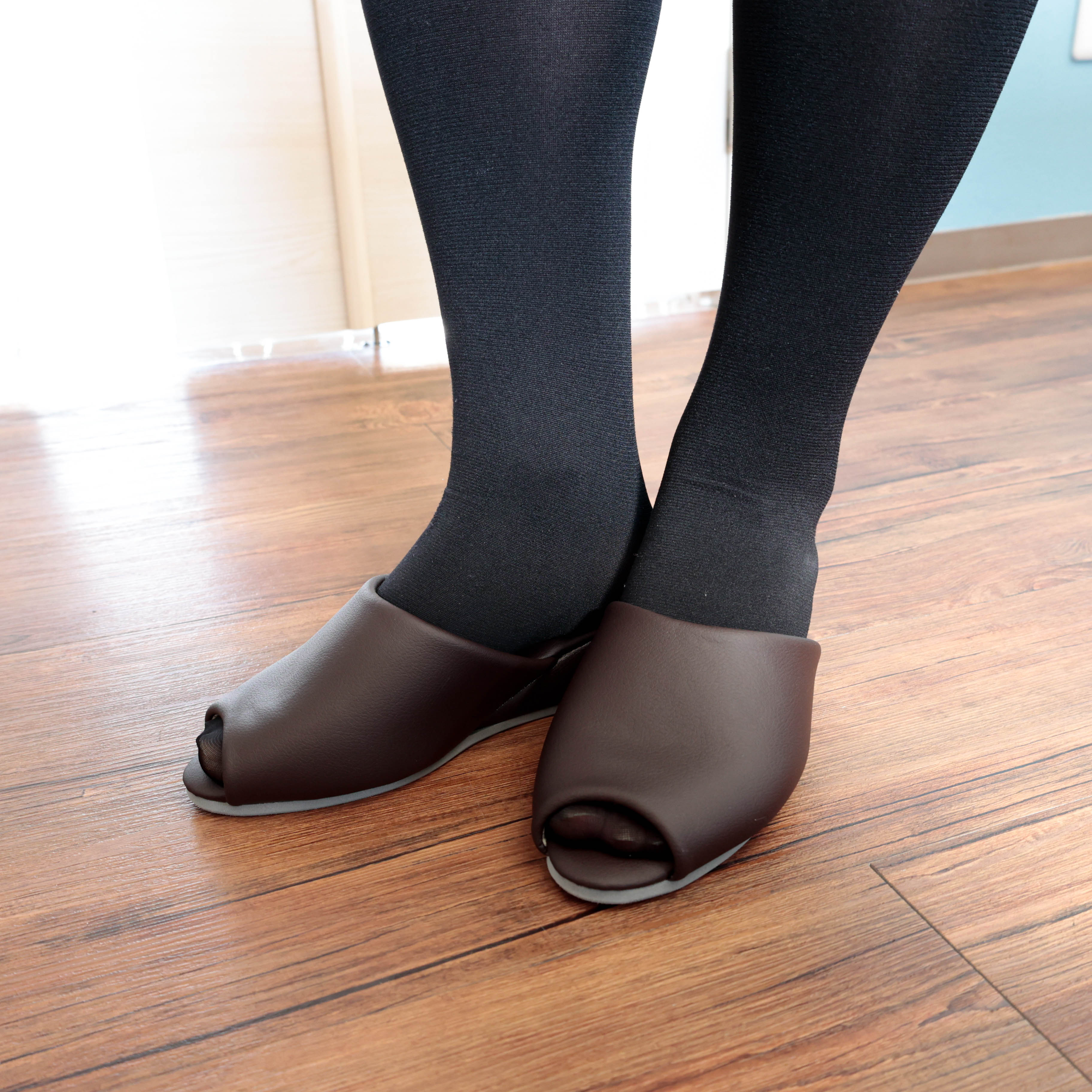 Sobagni自社工場で生産された国産エシカル合皮素材を使用し、4.5cmヒールのスリッパを作りました。とても上品で女性らしく、学校行事やスリッパ使用のオフィスなどに活躍。スタイルをよく見せてくれるうれしいスリッパです。