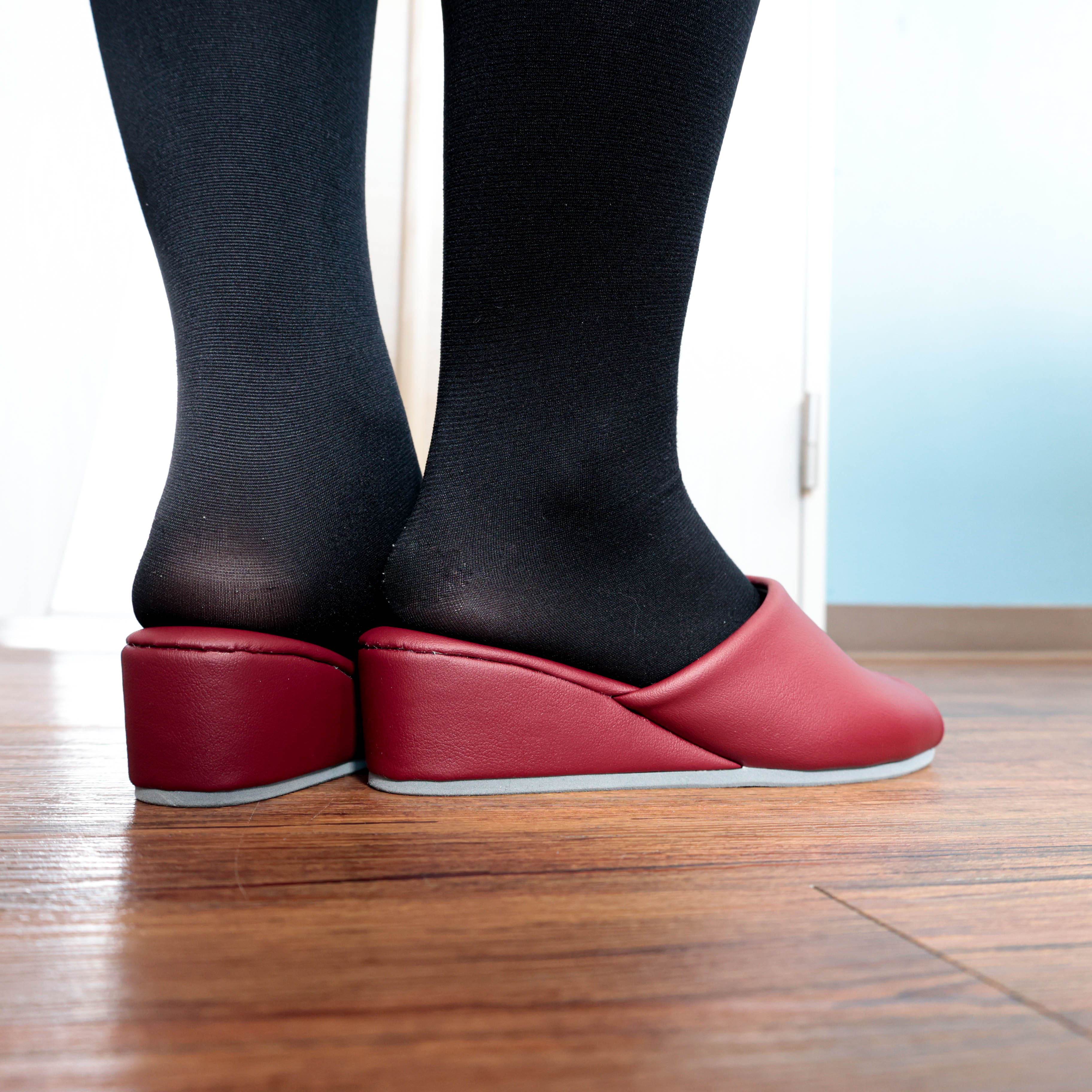とても軽い「木のヒール」を使用しているので、ヒール部分が潰れず安定した履き心地です。底材には、フローリングをキズつけにくいEVA素材を使用しています。(EVAにはクッション性と適度な滑り止め効果があります。)