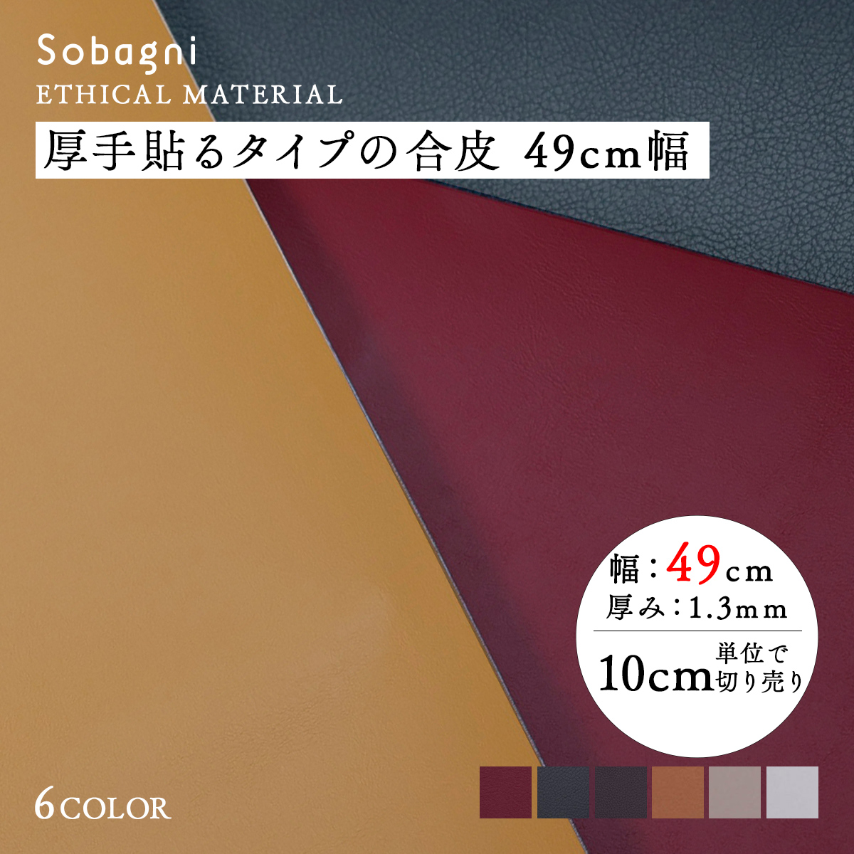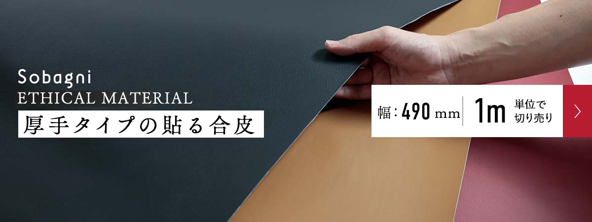 Sobagniのエシカル合皮の中でも、中厚(厚み約1.20mm)・軽量、適度な伸縮性のあるエシカルソフト。