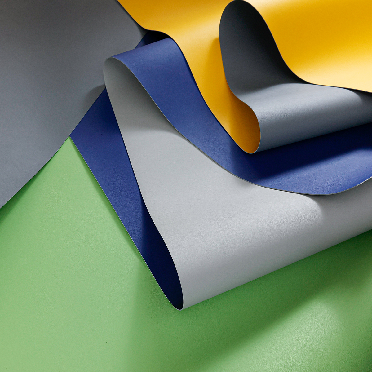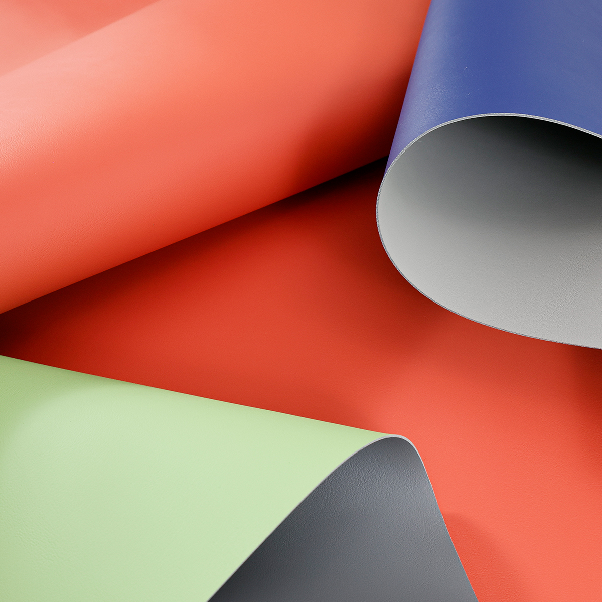自動車のシート材に使用される黒色の素材の裏面に、鮮やかなカラーを配しています。